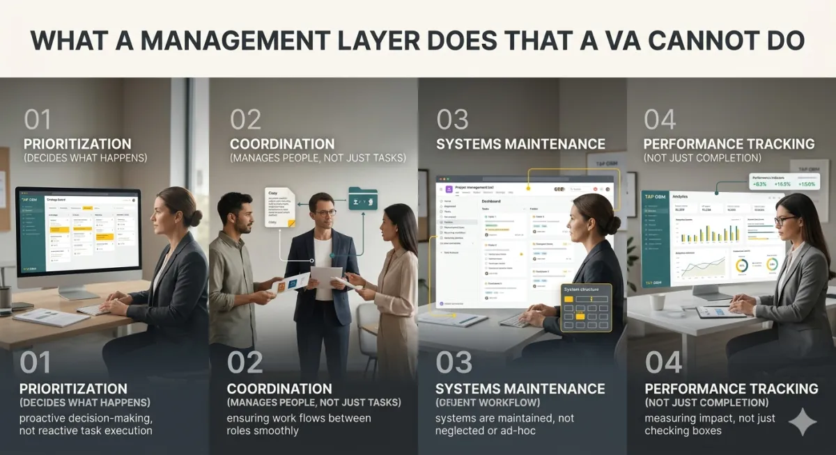 You hired a VA and you are still overwhelmed. You are thinking about hiring another one. The problem is not the VA. It is the absence of a management layer — and no amount of execution capacity will fill a management-shaped gap.