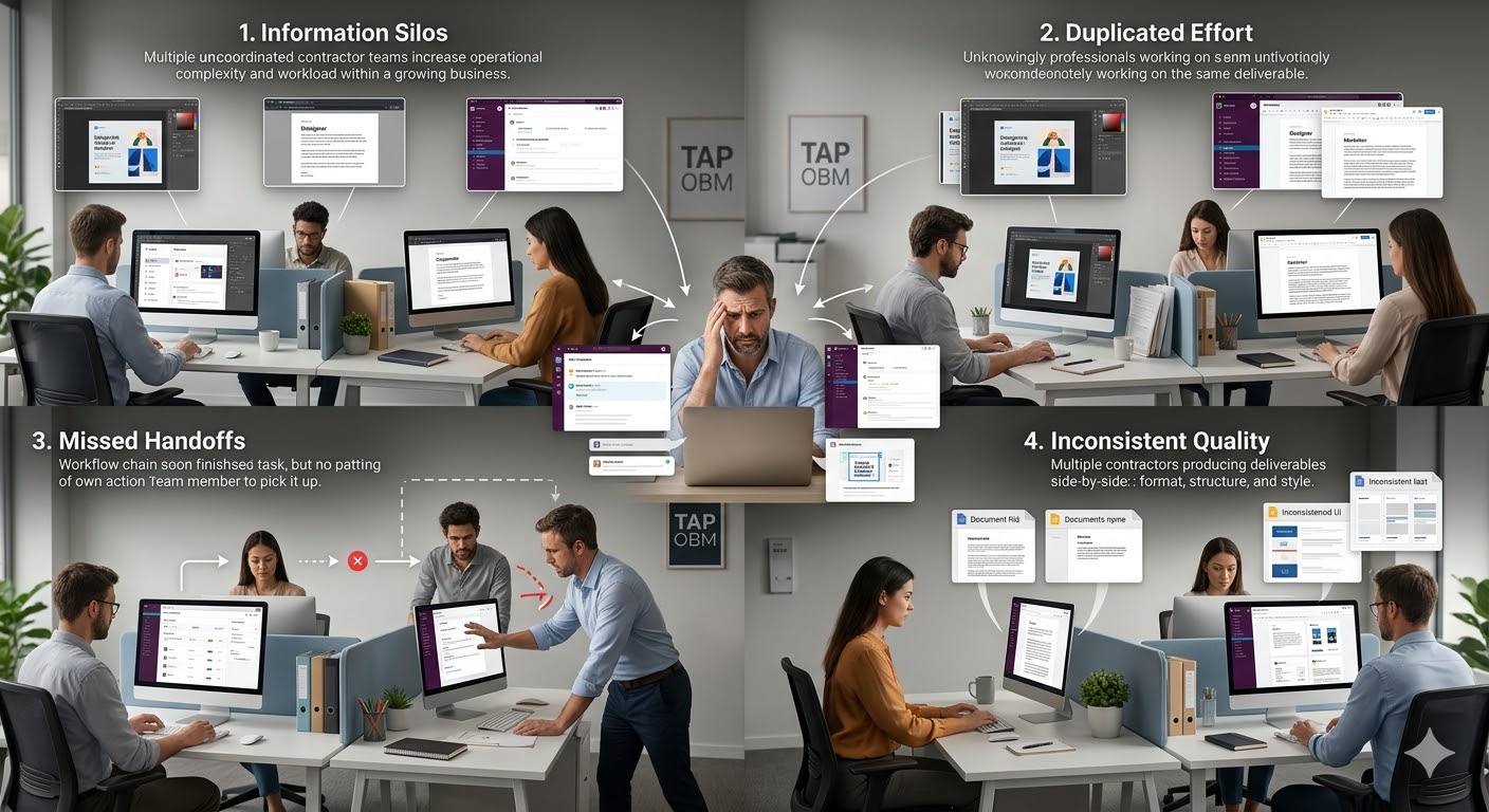 If you are struggling with managing contractors in your online business, the issue is not your people. Your VA is scheduling. Your copywriter is drafting. Your designer is creating. Everyone is busy. Nothing connects. The copy is finished but the designer did not know. The funnel is configured but the email points to a different page. Every person does good work. Nobody manages how it fits together. That somebody has been you.